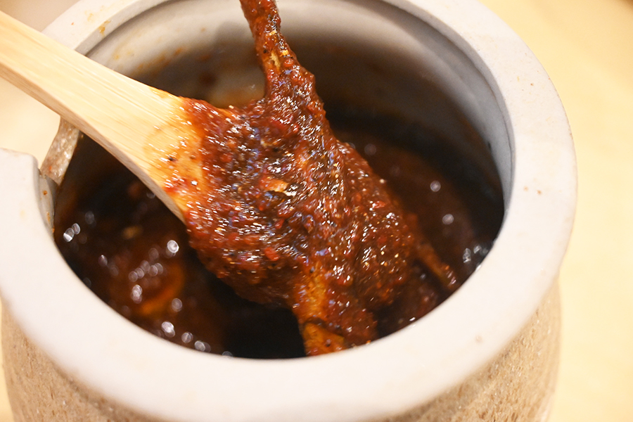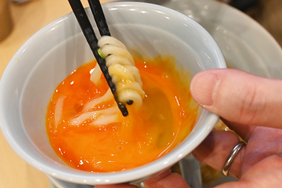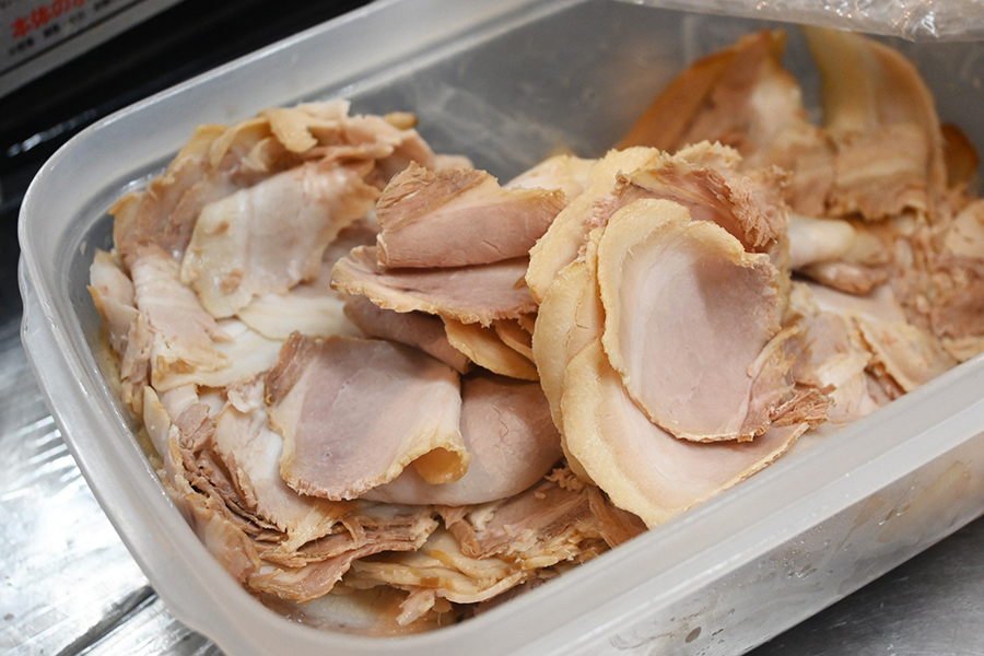そんな同店の看板メニューは「切り立てチャーシューうどん」(950円)。「島田製麺所」で仕込んだ豚清湯スープにホタテのエキスや煮干し粉入り。生姜オイルや煮干しオイルも浮かべ、たラーメン仕立てで、中央にはナルトまでのせてある。豚バラチャーシューは途中まで「島田製麺所」で仕込んだブロック肉をこちらでタレに漬け込み、注文が入る度にスライスしてうどんの上にずらりと。麺はもっちりつるりとした「悠々」の多加水うどんを使用しており、少し細くすることでスープ絡みもよく、茹で時間も短縮。素早い提供を実現した。