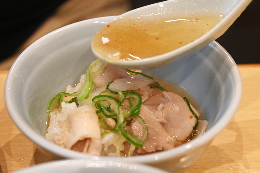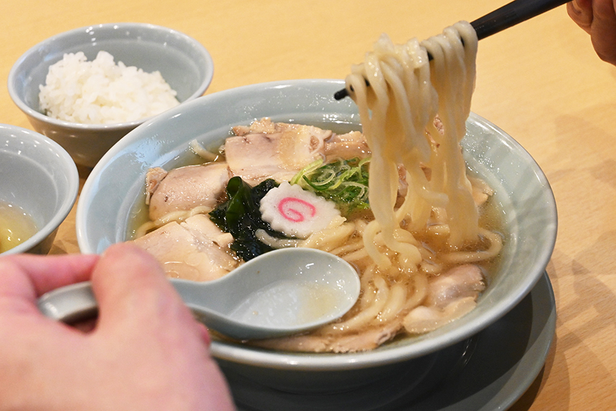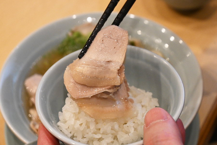 豚清湯スープはあっさりながらも深みがあり、生姜の風味や煮干しのダシ感がしっかり。チャーシューは切り立てだとカスカスせずにしっとりして熱いスープに旨みが馴染む。脂はしつこくなく肉のとろけ感と、タレの味付けが絶妙だ。白ごはん小が無料で付いているので、その上にバウンドさせてスープとチャーシューと米のアンサンブルを味わうのもオススメ。