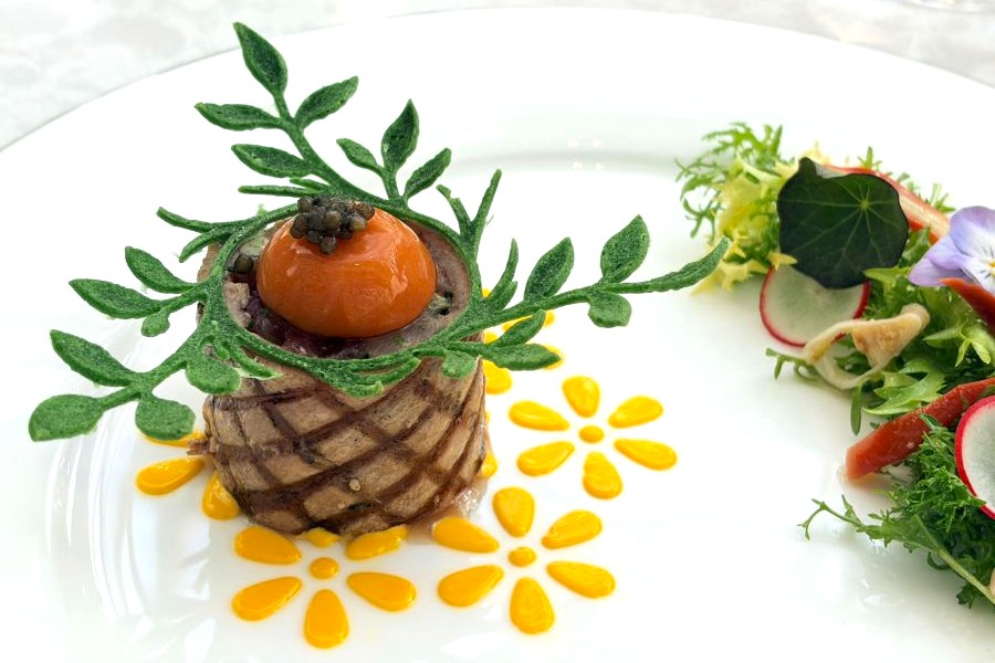 スタートは「序曲:小さな物語の始まり」として、サフランソースの花と葉の形にデザインされた、ほうれん草のチュイールチップ、エディブルフラワーがたっぷり飾られたサラダが、マグロのグリルを引き立てる可愛らしい一皿に。