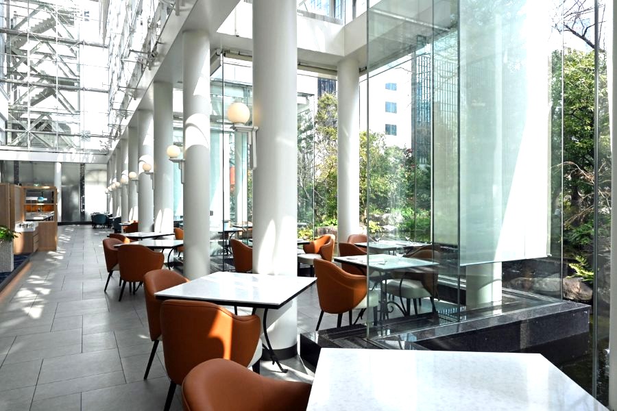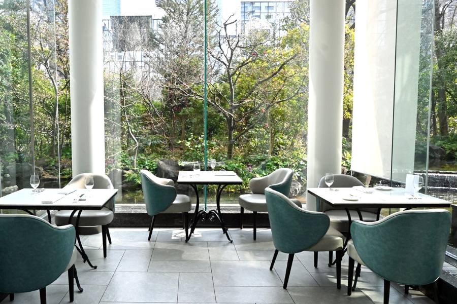 鳥たちも頻繁にやってくる庭園「中自然の森」に面した、3フロア吹き抜けのレストラン「アマデウス」は、光が降り注ぎ明るく開放的な雰囲気。まるで劇場のような空間に合わせて、新作ランチコースも、「舞台」をテーマに、一連の物語のように構成されている。