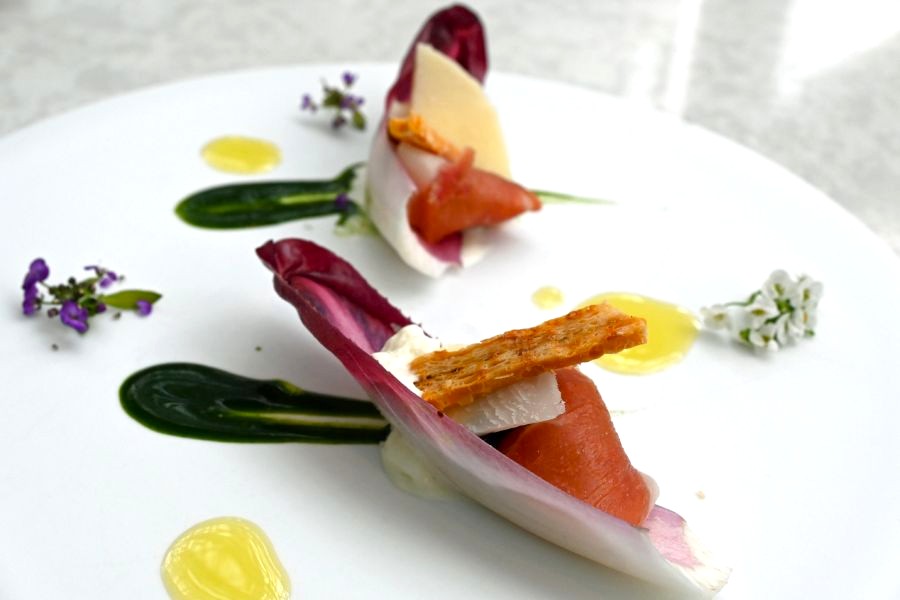 続いて「幕間:物語をあたためる」では、アンディーブ(チコリ)のサラダが美しく演出されて登場。雪下人参の暖かいスープは、驚くほどに甘みたっぷり。