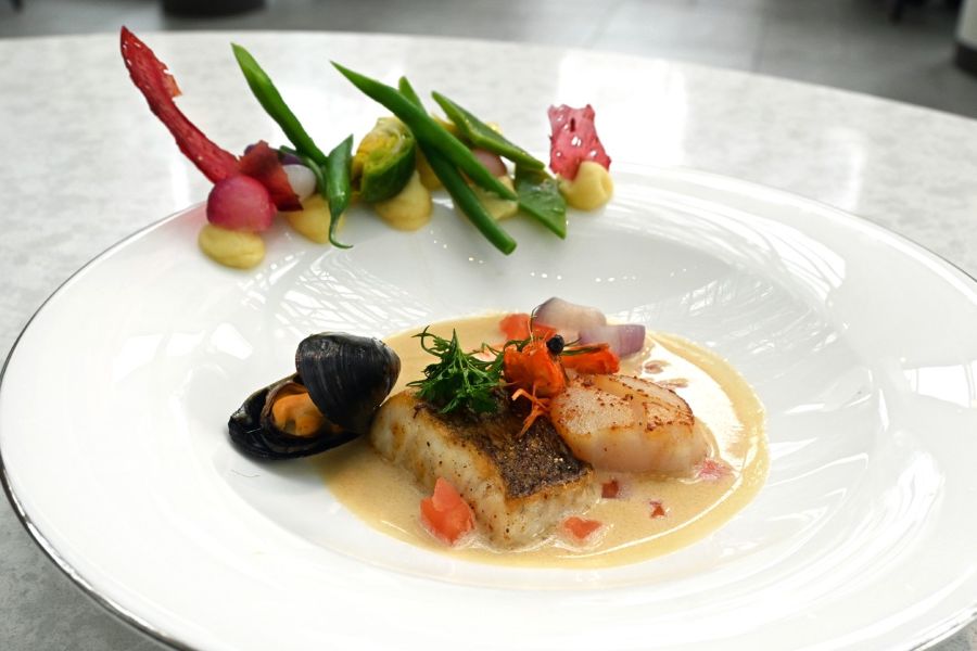 続いてシーンは「心踊る一幕」へ。メインは肉と魚からチョイスできる。肉は、ほろほろと崩れるほどにやわらかい黒毛和牛のグリルと、牛タンの煮込みの両方が用意されるという贅沢さ。魚は、皮目がパリッと焼かれたジューシーな鯛、海老、ホタテ、ムール貝に、魚介の旨みが詰まったソースがからみ、2種のパンとの相性も抜群だ。