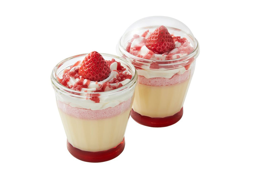 そのほか、いちご味のスポンジケーキ・ホイップクリーム・いちごソース・ストロベリーキャラメリゼで華やかに仕上げた「プリンパフェ(ストロベリーショートケーキ)」(540円)、やさしい甘さのいちごプリンとつぶつぶ感のあるいちごゼリーを重ね練乳ソースを後がけして楽しむ「濃いちごのプリン」(486円)も販売中。