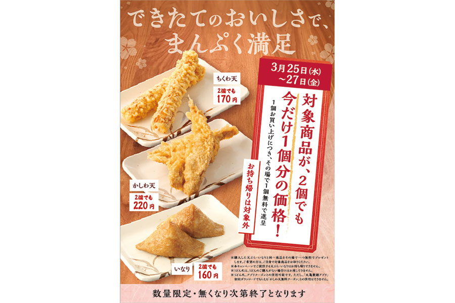 全国チェーンの讃岐うどん専門店「丸亀製麺」(代表:山口寛)は、対象商品を“1個買うと1個もらえる”お得な企画を実施。3月25日からスタートする。