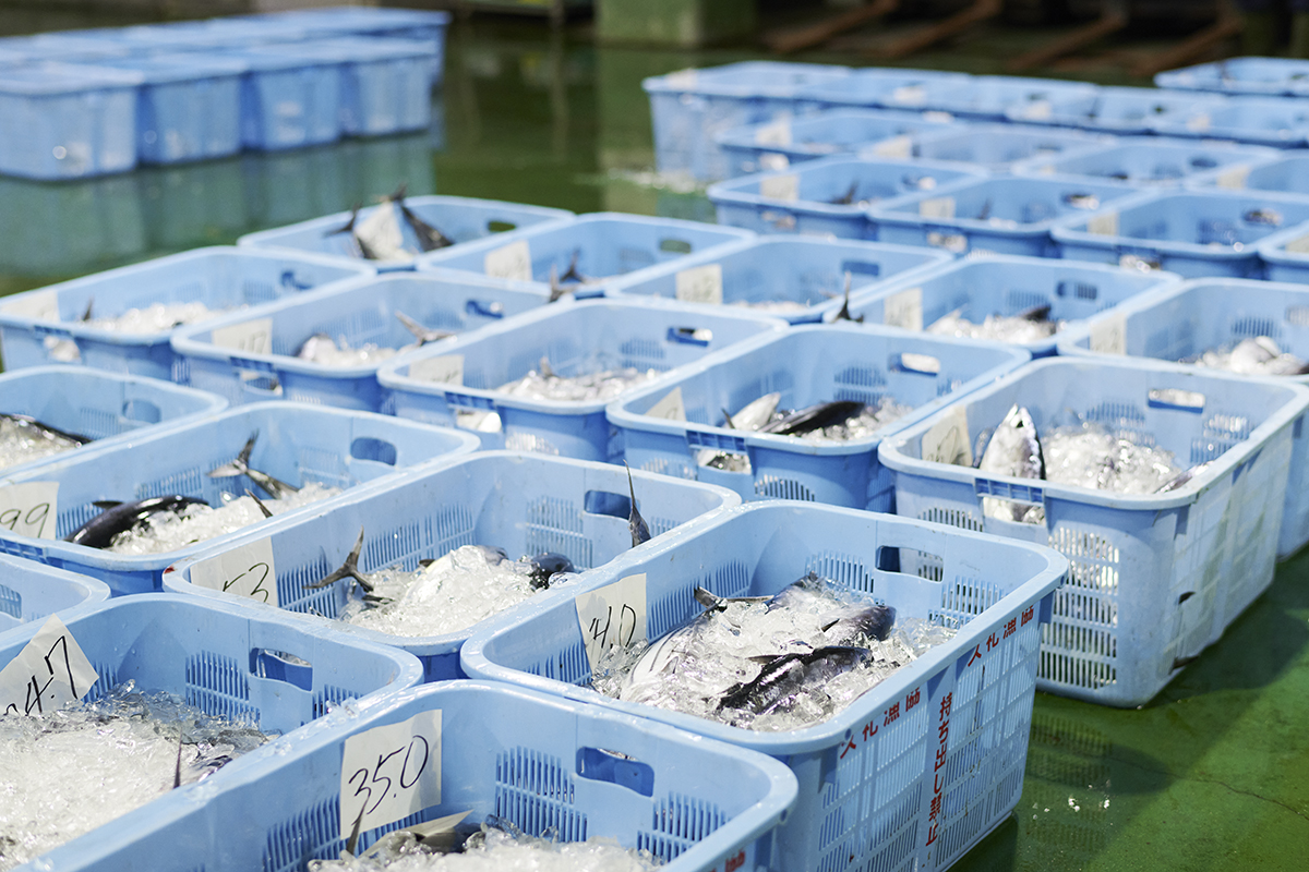 競り場に並ぶ魚は、ほぼカツオ。カゴ単位はもちろん、1尾から購入できるのも久礼漁港の特徴だ。状態不良のカツオであっても、オバ(尾切れ)やアゴ(アゴ外れ)など区分けして売る。その細やかさは、さすが「鰹乃国」! 仲買人がひしめく競りを間近で見学できる体験はかなり貴重だ。