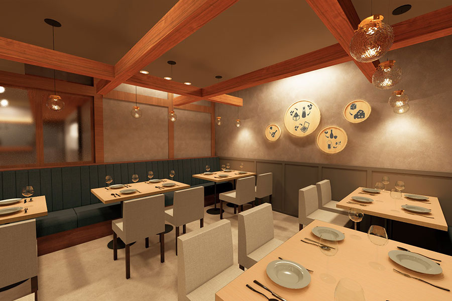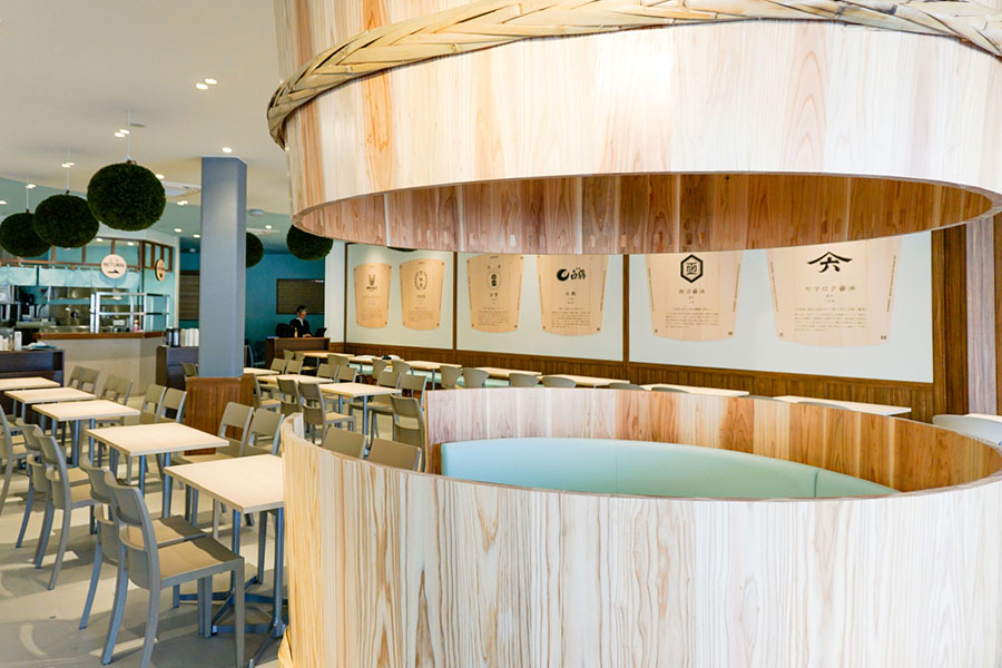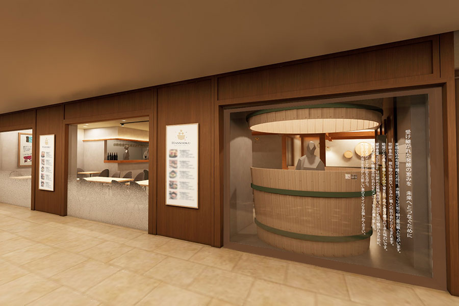 店内は、木桶、樽、瓶など発酵文化をイメージした素材を使用。温かみを感じる空間に、都会的な洗練さを加えた雰囲気で、万博会場から移設した什器も使用されるという。