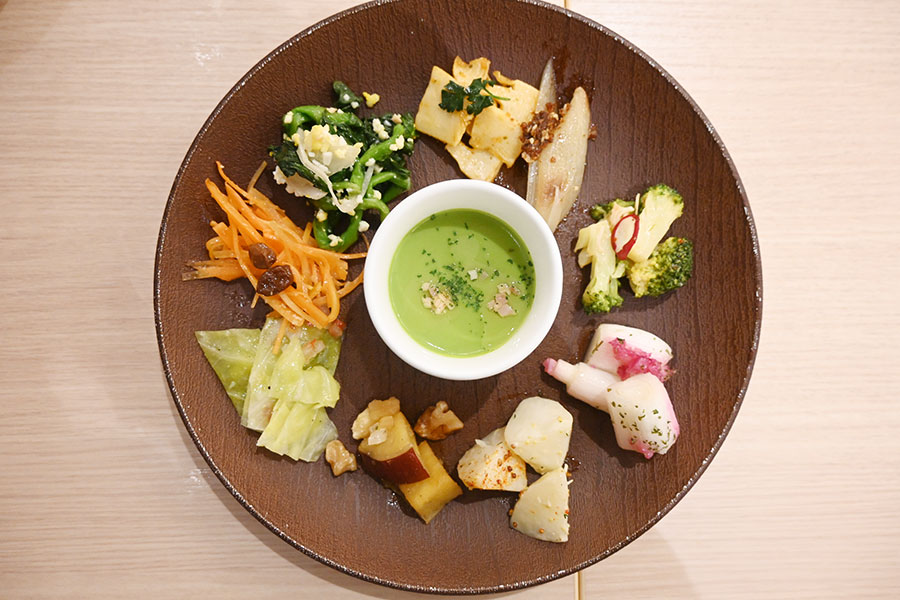 ビュッフェ台には「白ねぎのヴィネグレット」や「菜の花のアーリオ・オーリオ」、「野菜の巻き寿司」など、色とりどりな野菜を活かした個性的なメニューが揃っており、おいしいだけでなくヘルシーな料理をたっぷりと味わえる。