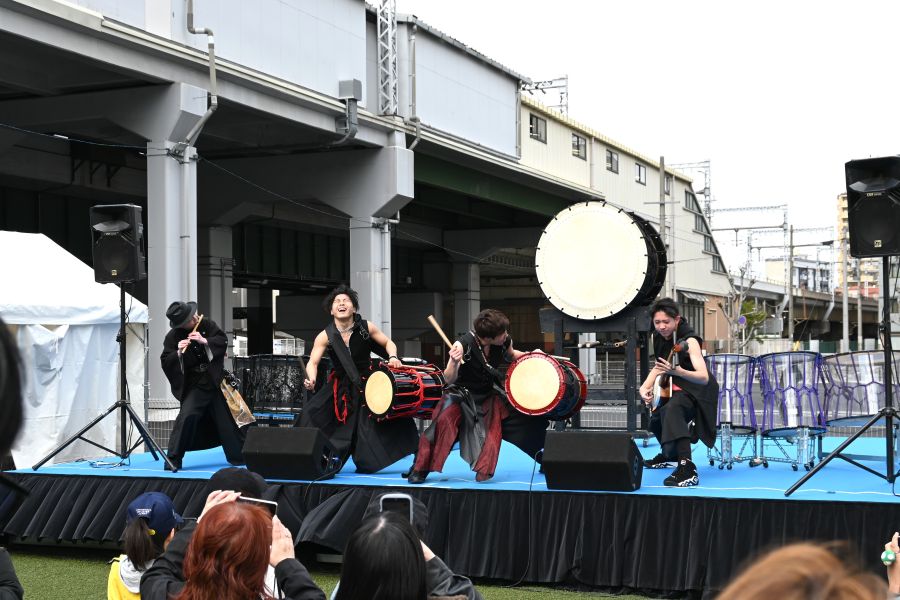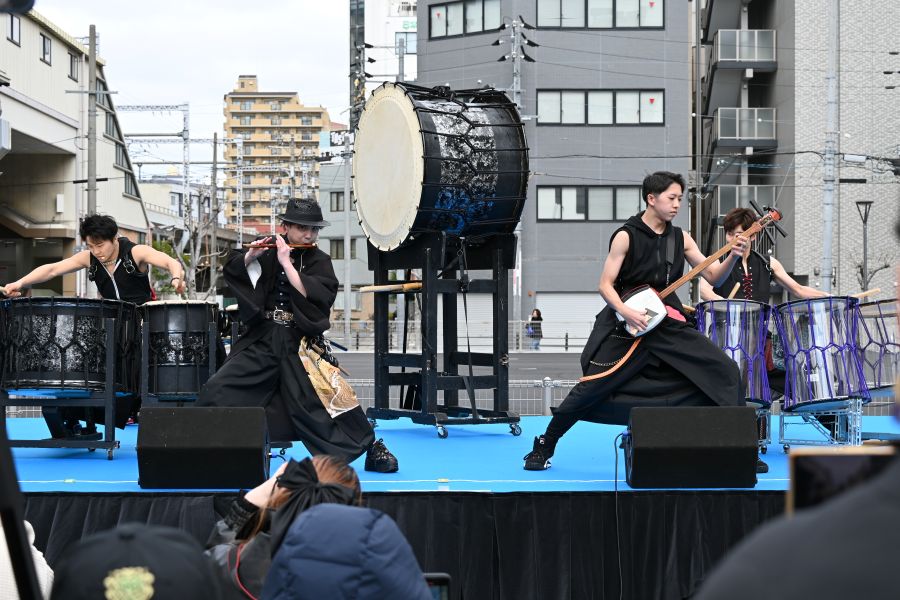 • 和楽器のパフォーマンス集団「若虎」に、近隣だけでなく遠方からもファンが集まった。実は屋外パフォーマンスは初めて。観客も手拍子で一緒にライブを盛り上げた(3月15日「あつまろう!べんてんひろば交流DAY」)