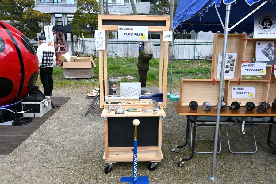 • 学生が作成した組み立て式のディスプレイー台には、町工場で製作した部品や商品を展示。野球練習用のバッティングティー「サクゴエ」は、町工場7社が共同開発。プロ球団も採用している(3月15日「ガレージBENTEN」)
