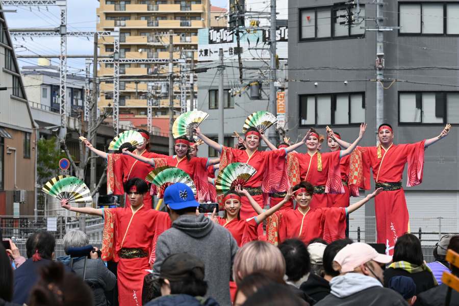 • 大阪ミナミ道具屋筋商店街の道具屋筋まいど連の「よさこい踊り」では、ステージの周りも使ったクライマックスの総踊りもあり、一緒に踊り出した観客も(3月15日「あつまろう!べんてんひろば交流DAY」)