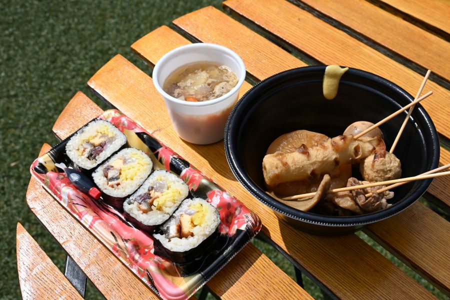 • 「創作寿司ひかり」の具沢山の海鮮巻き寿司は、特別価格の500円で販売。「西長堀すずき」の静岡おでんも人気だった(3月15日「あつまろう!べんてんひろば交流DAY」)