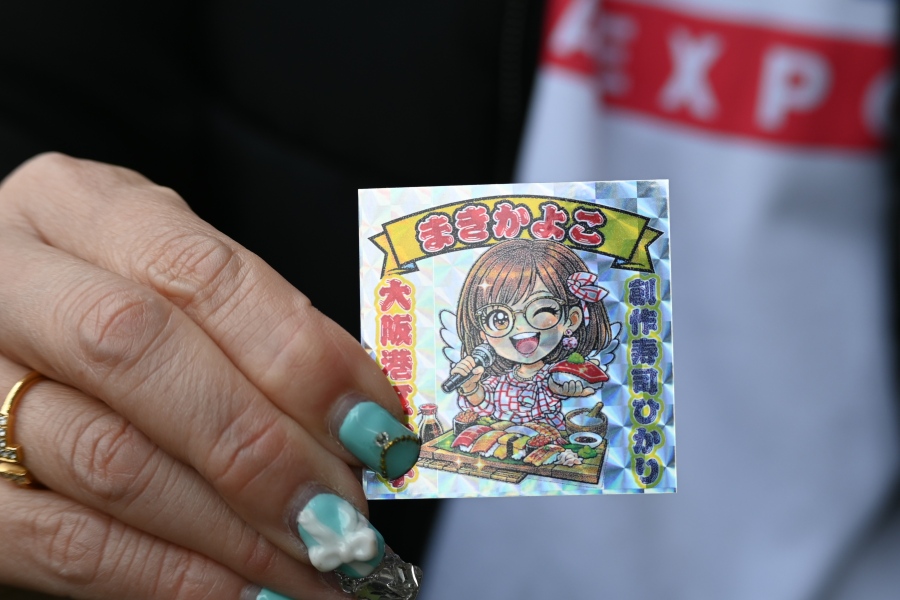 • 港区で飲食店を営む人を中心に、街や万博を盛り上げる「大阪港区女子」。こちらは牧さんのオリジナルのキラキラシール(3月15日「あつまろう!べんてんひろば交流DAY」)
