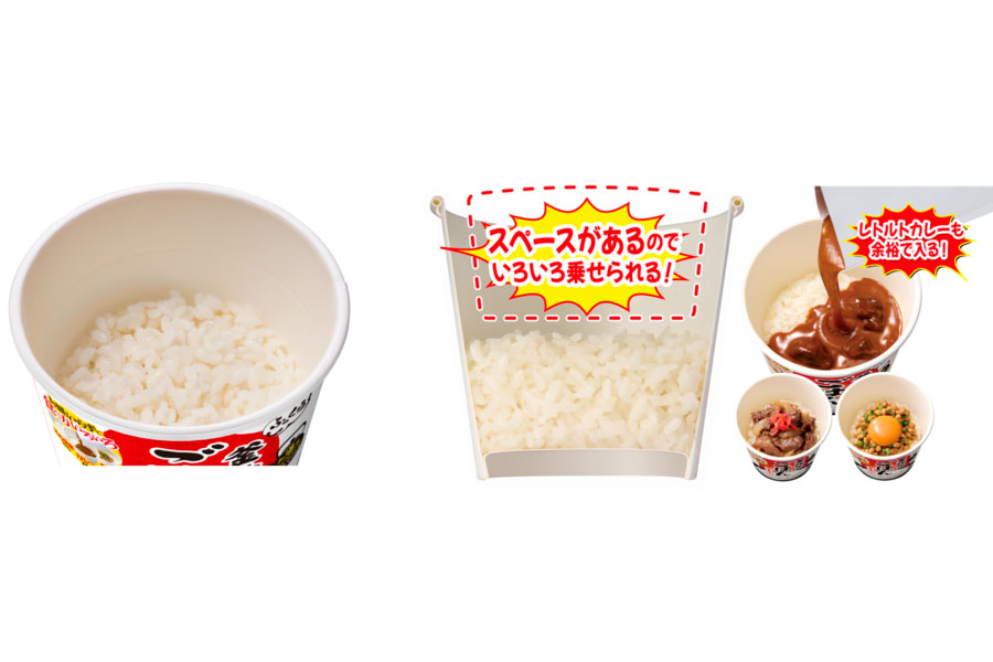• カップ内に十分なスペースがあるため、ごはんの上にレトルトカレーや牛丼の具などをのせてもこぼれず、さまざまなメニューを手軽に試すことができる