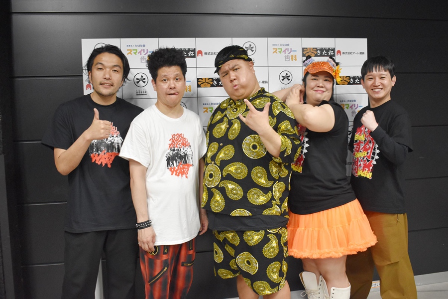 • 『真剣音楽祭』に出演したメンバー。左から見取り図・盛山、ダブルアート(タグ、真べぇ)、くまま(熊元プロレス)、kento fukaya(3月20日・住之江区)