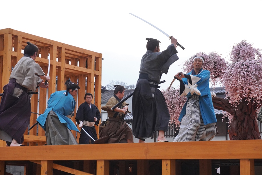 演じられる作品は定期的に変更される予定で、オープンから5月31に日までは『花嫁道中 桜の宴』が披露される。舞台となるのは祝言の1日。花嫁道中がおこなわれる日、村全体は祝賀ムード包まれている一方で花嫁道中を狙う不穏な噂も広っており…村人と新選組が町を巡りながら噂の真相に迫っていく。やがて迎える行列のとき、村では大殺陣が繰り広げられる。同プログラムは1日2回(13時半〜、17時〜)開催。上演時間は約30分。