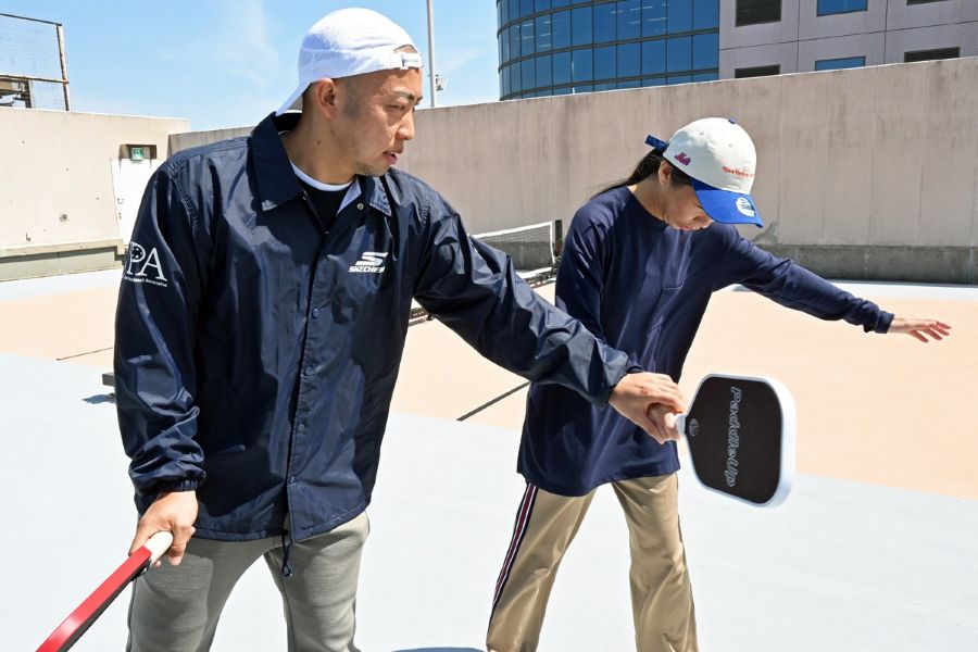 • 「ラックハウジング ピックルボール ベース オオサカ」に常駐するコーチの佐藤さんから「ピックルボール」のレクチャー