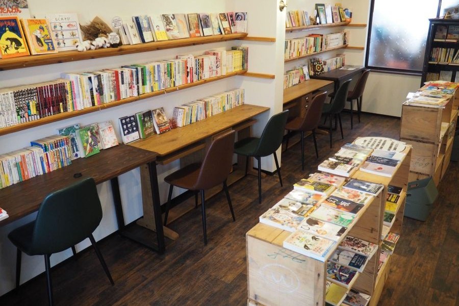 「本屋 亜笠不文律」では、新刊本の販売だけでなくカフェ営業も展開。飲食スペースである2階には閲覧用と販売用の古本が置かれており、テーブル席で読書&ティータイムのゆったりした時間を過ごすことができる。