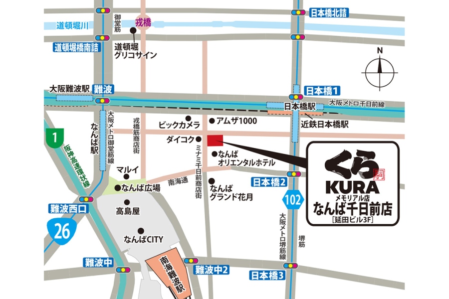• 「くら寿司 メモリアル店 なんば千日前」までのアクセスMAP