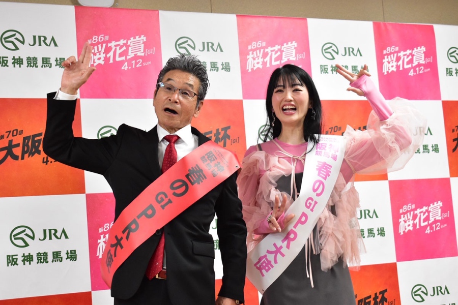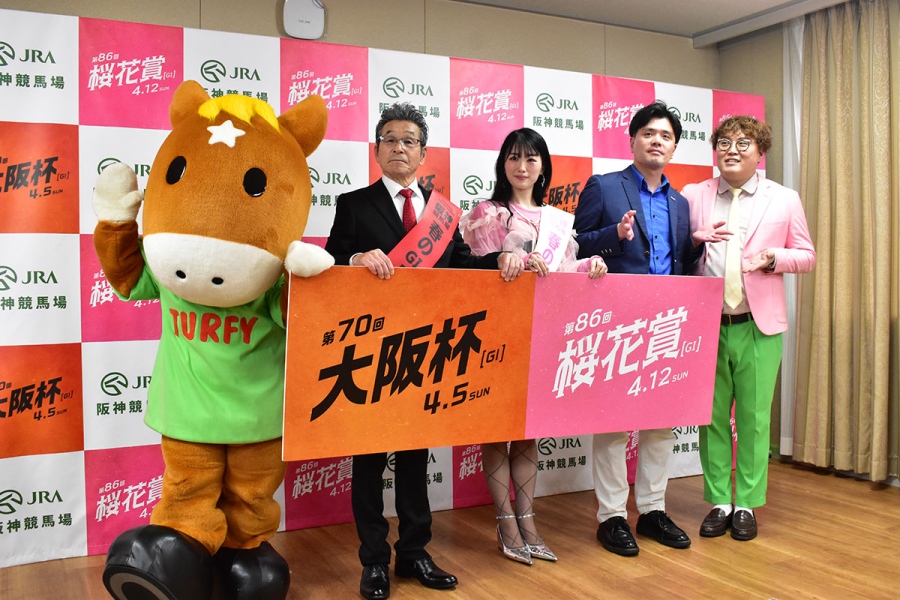 • 「JRA阪神競馬場」PR大使の間寛平、応援ゲストのマユリカ阪本と中谷(大阪市内・3月31日)