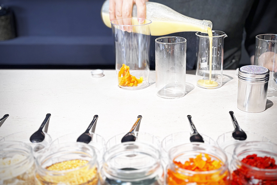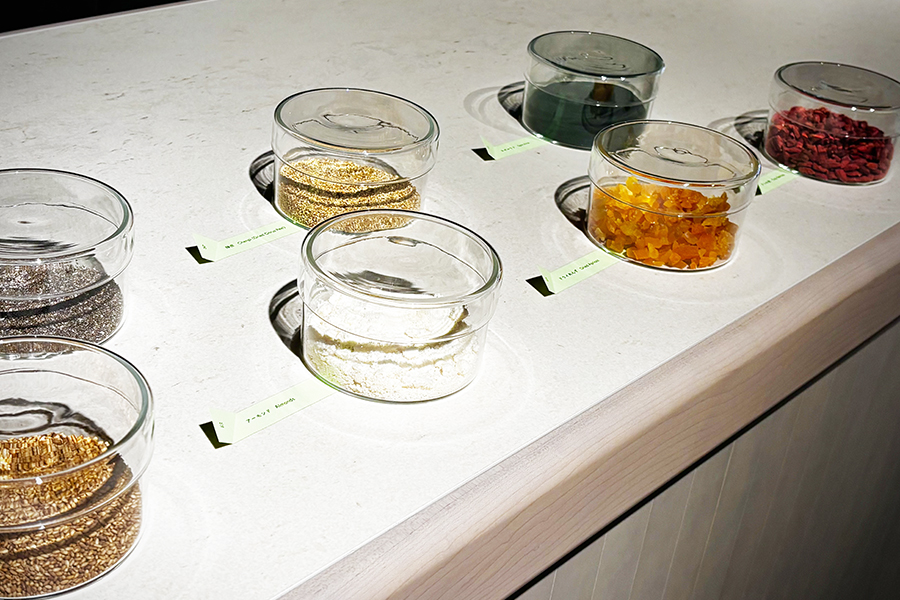 カフェ「Ferment Bar(ファーメントバー)」では、“善玉菌を醸す食体験”として、甘酒をアップデートした甘酒スムージーが登場。まず「蜜柑・マンゴー・山椒」(1,320円)や「苺・豆乳ヨーグルト」(880円)など、ベースとなる甘酒を5種類の中から選び、さらに「黒米甘酒」「豆乳バニラ」など数種類から上にのせる寒天をチョイス。