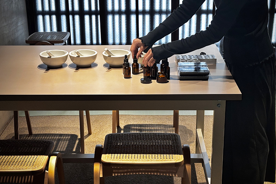 香りを醸す部屋がテーマの「Scent Lab(セントラボ)」では、東京・蔵前で人気のホームフレグランス調香専門「kako(家香)」による線香作りのワークショップ(ウェブサイトから事前に要予約)が体験できる。香りの組み合わせはもちろん、香料の割合を変えることで、自分好みの調香ができるのが面白い。今後はお匙 京都オリジナルの線香も販売予定とのこと。