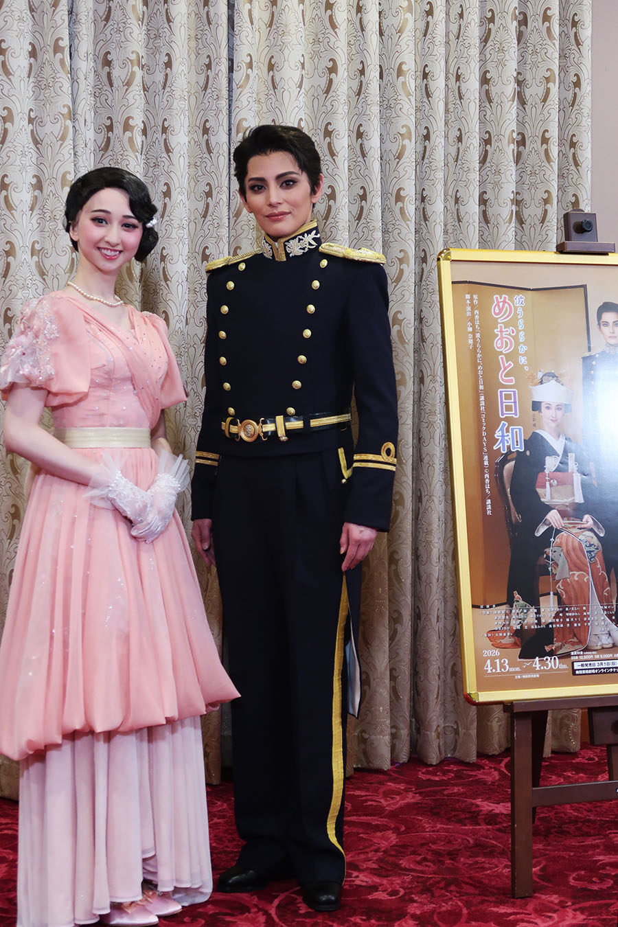 前日の12日、公開舞台稽古に続き、主演の朝美と音彩が出席する取材会がおこなわれた。舞台上でも「新婚夫婦」を演じているふたりの初々しいやり取りが、新鮮なひとときとなった。