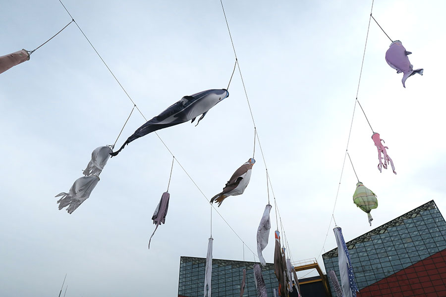 • 海遊館で暮らす生き物たちをモチーフにした「ジンベエのぼり」(4月12日・海遊館/Lmaga.jp撮影)