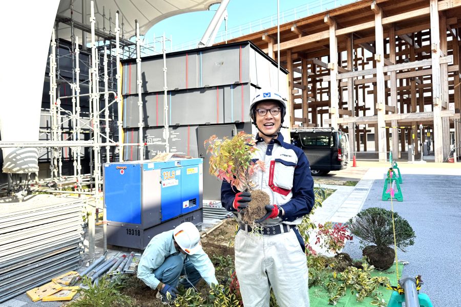 • 会場で植栽を手にする「平田運輸」の平田社長。「心ある未来を創る」を掲げ、環境省主催の「令和7年度 気候変動アクション環境大臣表彰」を受けるなど、環境に配慮した経営を実践する(写真提供:平田運輸)