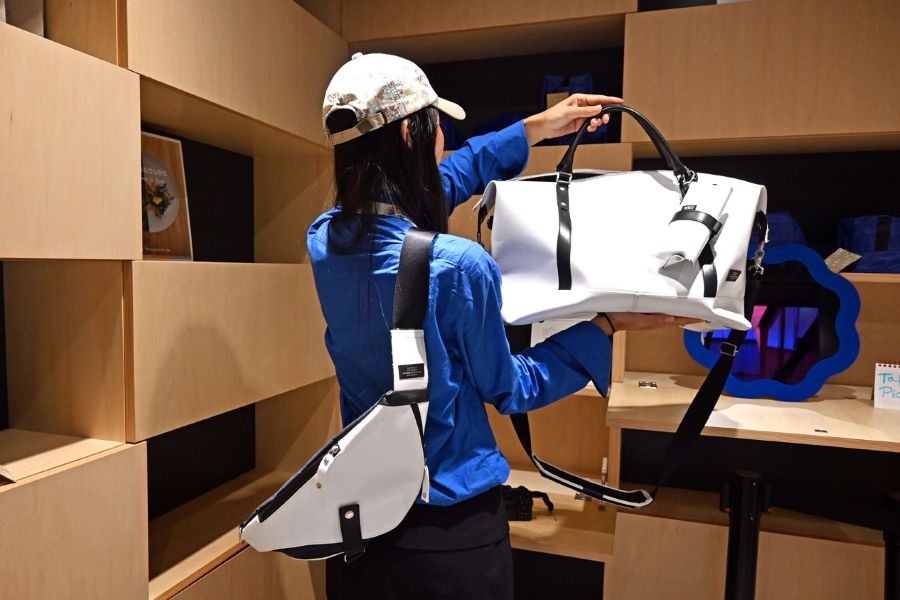• 膜屋根は、軽くてしっかりとした素材なので、スタイリッシュなバッグに。財布、メガネケースなども展開(大阪・関西万博 2025年10月12日撮影)