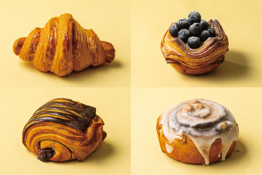 • 左上から時計回りに「リアルパリクロワッサン」「ブルーベリーデニッシュ」「シナモンロール」「パン・オ・ショコラ」