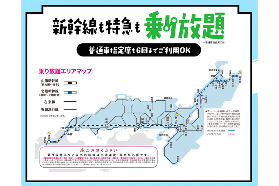 「WESTERポイント全線フリーきっぷ」は、JR西日本全線&智頭急行線の普通列車(新快速・快速を含む)が乗り放題のきっぷ。「新幹線」と「特急列車」の普通車自由席も乗り放題となり、普通車指定席は6回まで利用できる。1名からOK。※寝台列車など一部列車・設備は除く