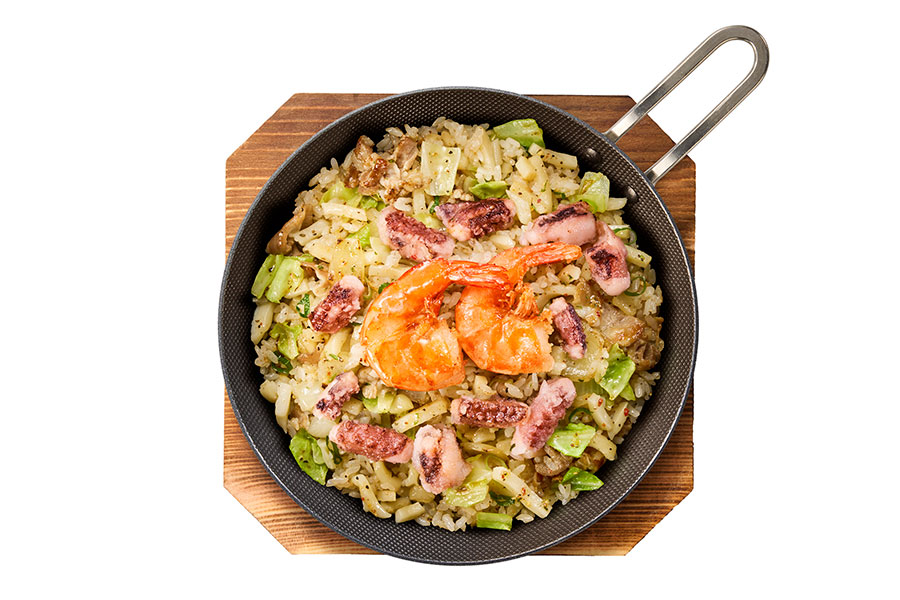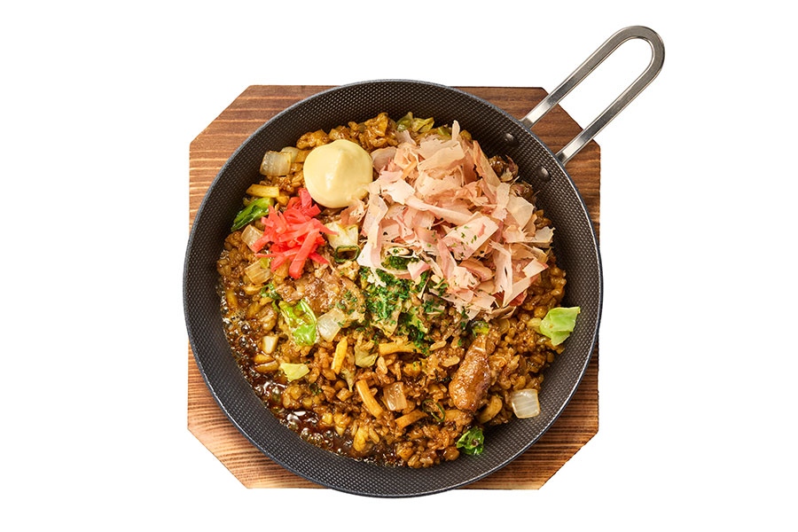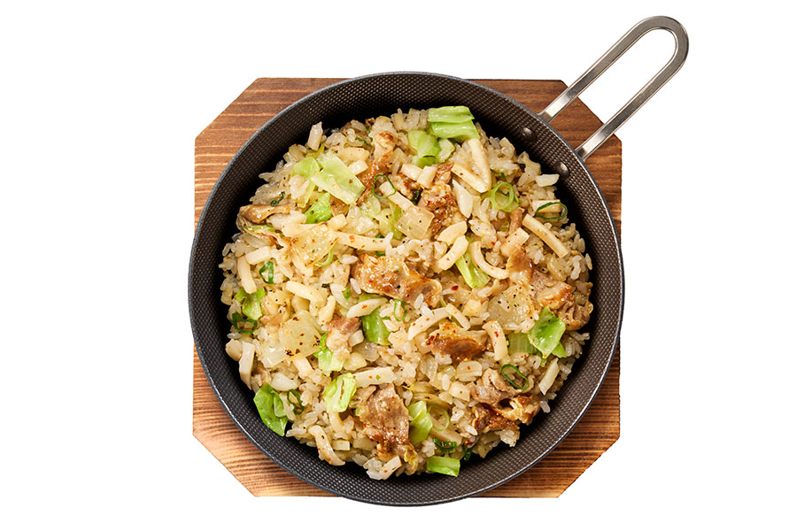 ごはんの粒と相性の良いうどんのサイズ感・割合にこだわり、独特のふわもち食感を実現。豚肉や野菜など具だくさんで、食べ応えのある一皿となっている。