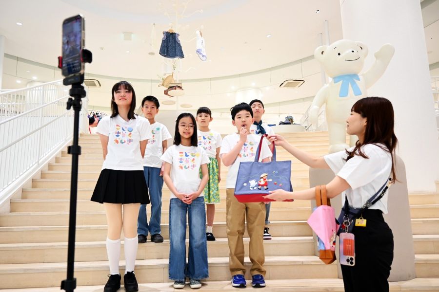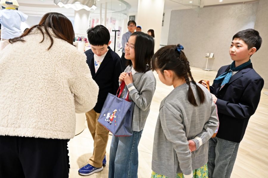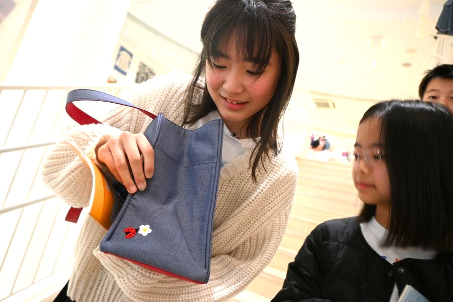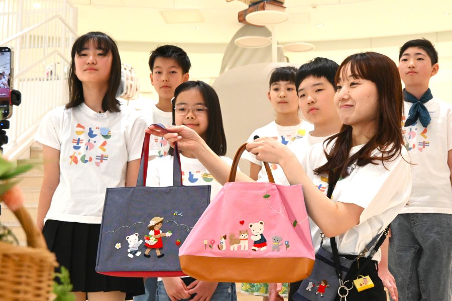 • 完成したデニムバッグを子どもたちに紹介してもらいました(「ファミリア神戸本店」2026年3月撮影