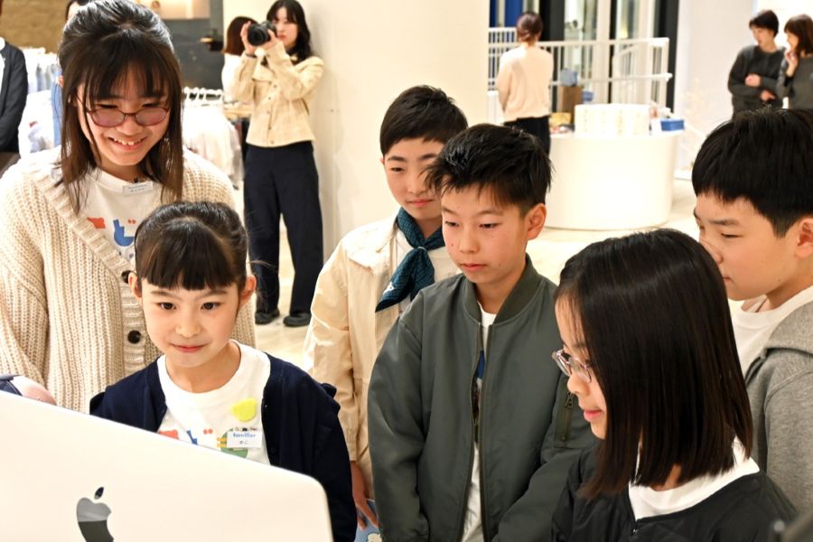 • 完成したデニムバッグお披露目で「ファミリア神戸本店」からInstagramのライブ配信も実施。ちょっと小学生たちは緊張ぎみ…?(「ファミリア神戸本店」2026年3月撮影)