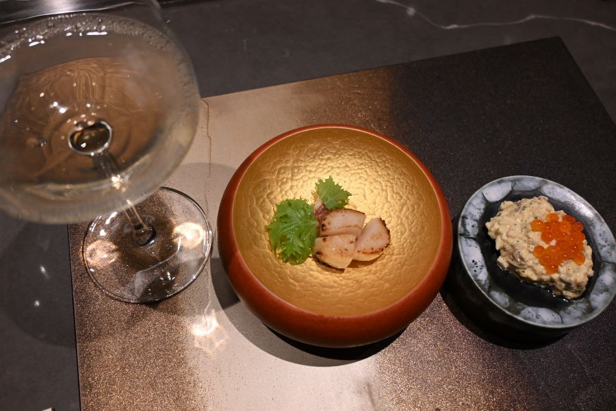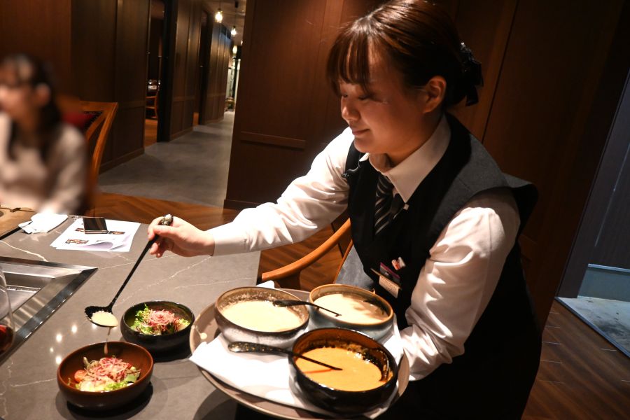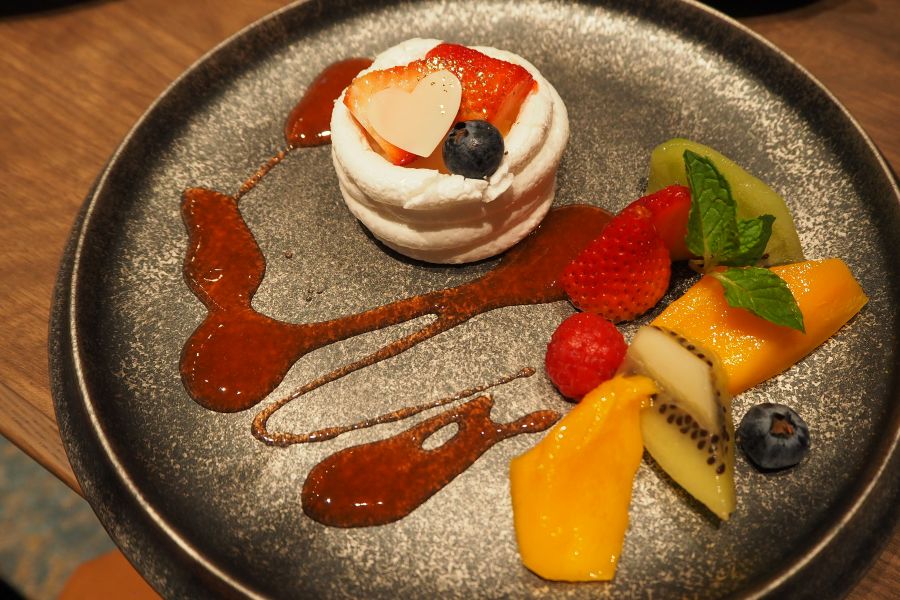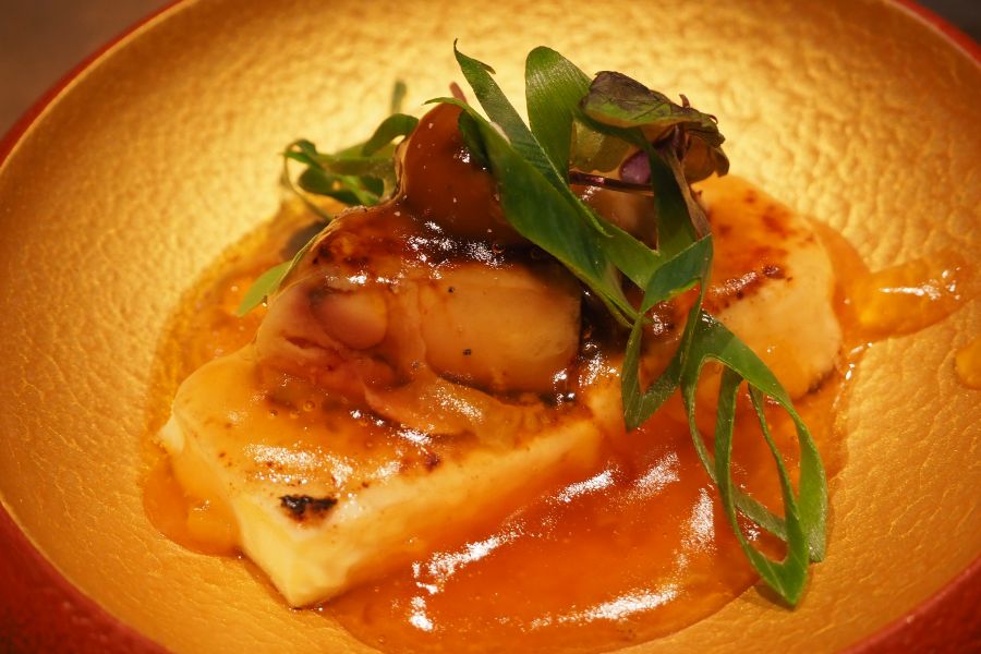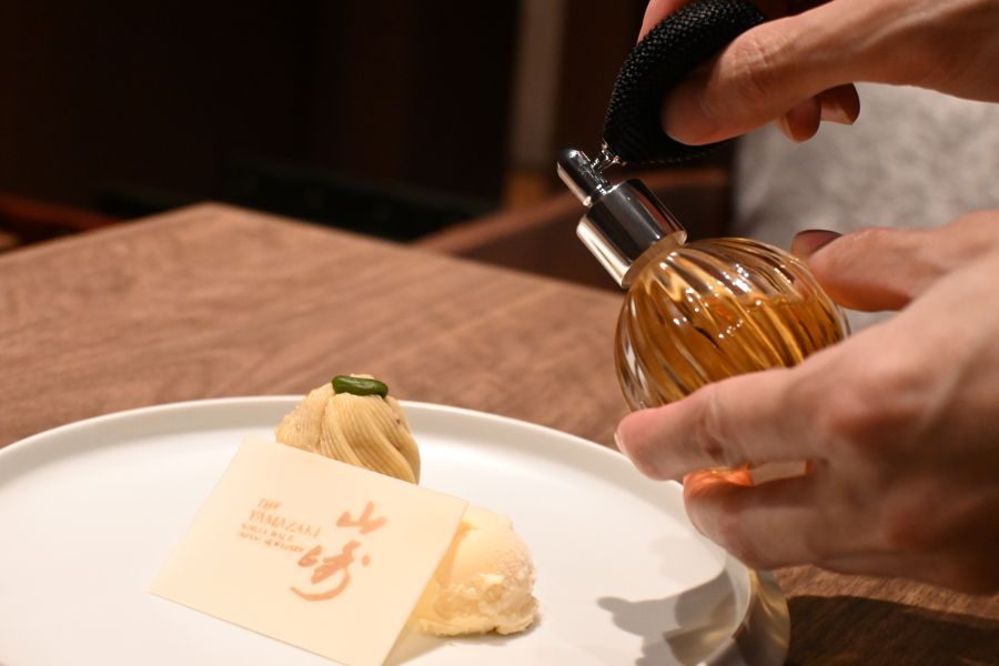 ディナーコース「福瑞」(1万6500円)ではメインで黒毛和牛ステーキと焼きしゃぶの2種を食べ比べができ、フォアグラや帆立の鉄板焼き、デザートには「サントリー」のウイスキー「山崎」を使った大人風モンブランなど、和洋折衷の多彩な味わいで贅沢気分に。