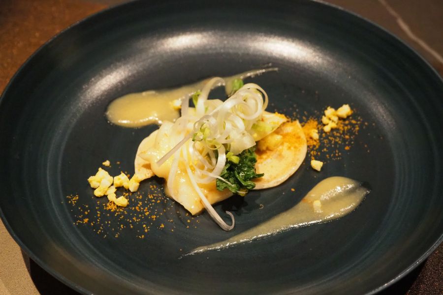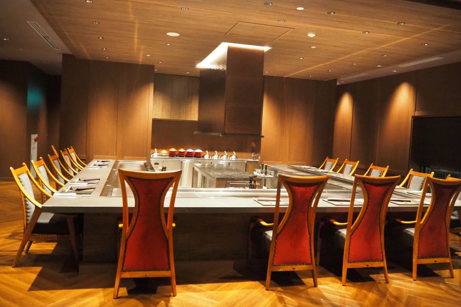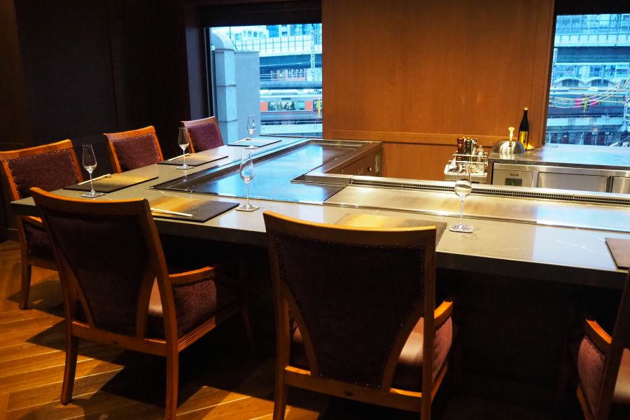 旧店舗の煉瓦を加工した箸置きや器など「レガシー」が取り入れられた新店は、見通しのよいコの字型の鉄板焼きカウンターをはじめ、スイーツを食べる際のテーブル席や6名まで対応可能な個室もあるスタイリッシュな空間が魅力だ。