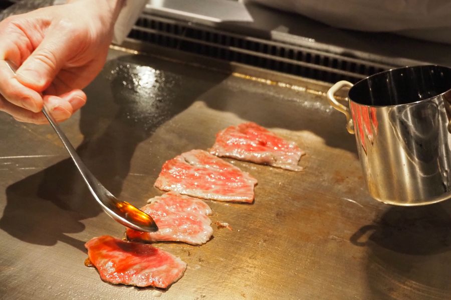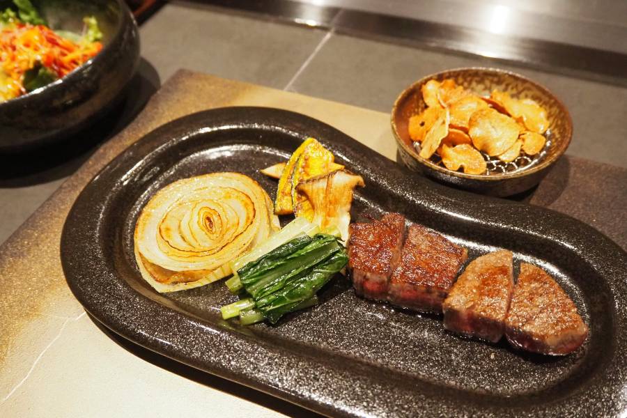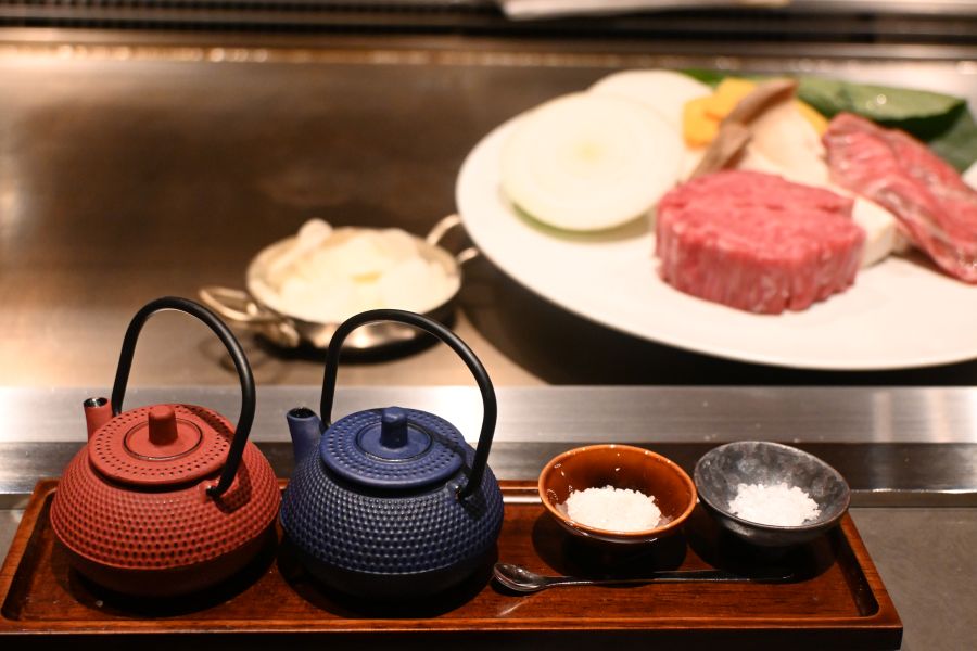 その一方で、かつての常連客らにうれしい旧「ロイン」から引き継がれたこだわりポイントも。鉄板焼きの旨味を最大限に活かすべく、2種の塩やにんにくを3カ月以上漬け込んだ醤油、さっぱりした後味にしたい時のポン酢が用意されていて、好みに応じて味変できるのがうれしい。