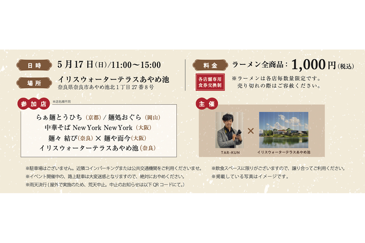『大和麺祭 創-sou-』(奈良県奈良市あやめ池北1-27-8)は11時から15時まで。ラーメンは全て1000円。入場無料。「イリス」でのみソフトドリンク付き前売券を発売。近鉄「菖蒲池駅」より徒歩7分。ほか詳細は公式サイトにて。