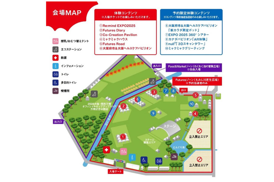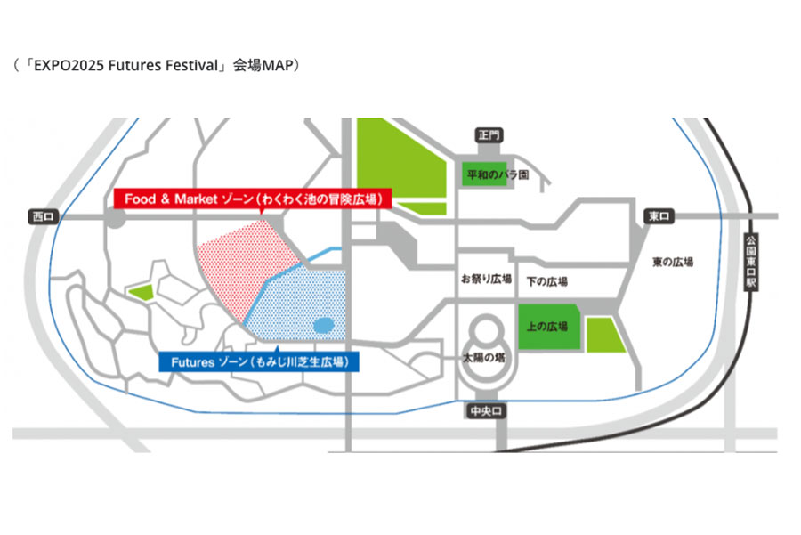 『EXPO2025 Futures Festival』の日時は、4月12日・10時〜20時頃(Food&Marketゾーンは19時30分まで※LO.19時)。混雑時には入場制限を行う可能性あり。入場無料※別途、万博記念公園への入園料(自然文化園・日本庭園共通チケット)450円が必要となり、事前に前売り電子チケットの購入がおすすめ。