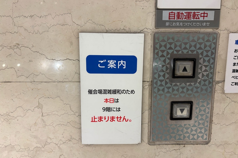 エスカレーターの利用が制限され、9階「催会場」に入場できない様子(4月9日撮影/Lmaga.jp編集部)