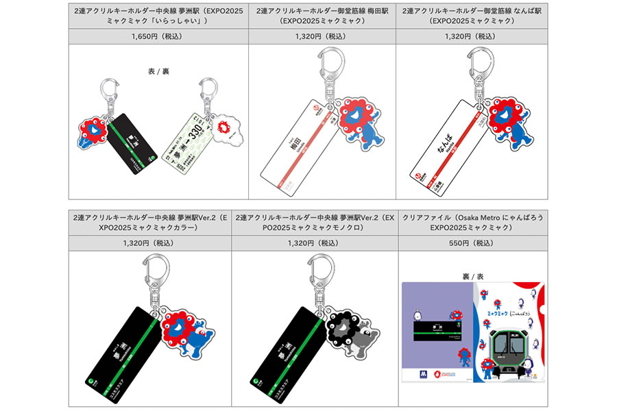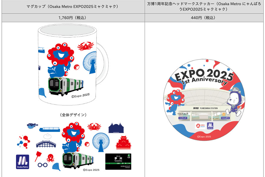 そのほか新作アイテムとして「万博1周年記念ヘッドマークアクリルコースター」(1100円)、「ハンドタオル(Osaka Metro EXPO2025ミャクミャク)」(990円)、「車窓クリアファイル(中央線400系 EXPO2025ミャクミャク)」(550円)が登場する。