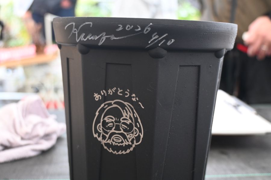 イベント中の勲造さんは大忙し。来場者たちから、「この植物はどこにありますか?」「どうやって育てたらいいですか?」「写真一緒に撮ってください」「鉢にサインを」と次々に声をかけられ、携帯もなりっぱなし。