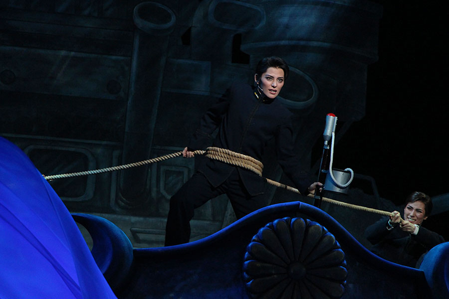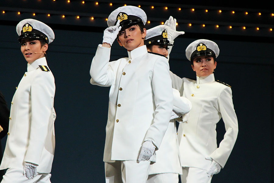 女性たちが社会で活躍する様子や、海軍士官たちの結束を明るいナンバーで魅せ、芸者見習いの講釈師、小菊(夢翔みわ)と久桃(白綺華)に物語をときどき解説させるなど、ストーリー展開はスムーズ。