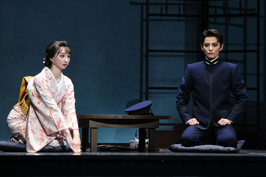 堅物だけどお茶目さをあわせもつ帝国海軍中尉・江端瀧昌を好演する、宝塚歌劇団雪組トップスター・朝美絢(あさみ・じゅん)。かたわらには、トップ娘役に就任した音彩唯(ねいろ・ゆい)が、新妻の江端なつ美として寄り添う。