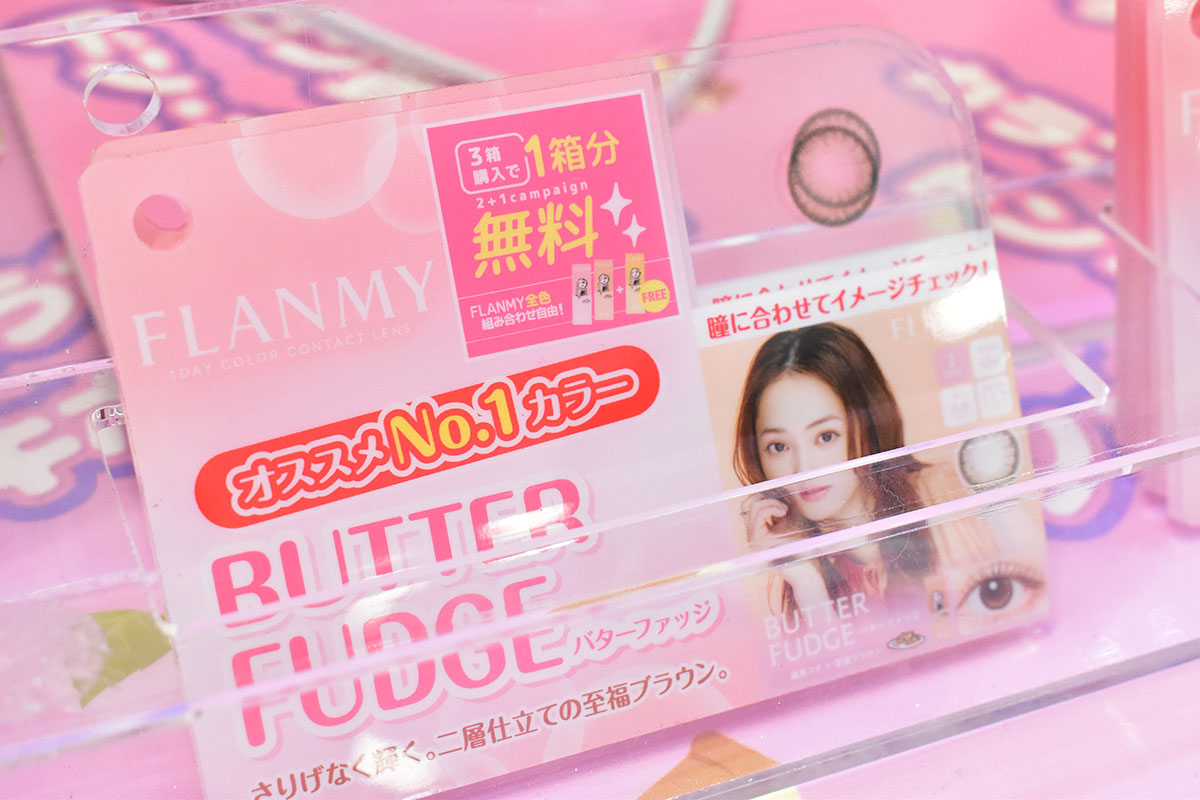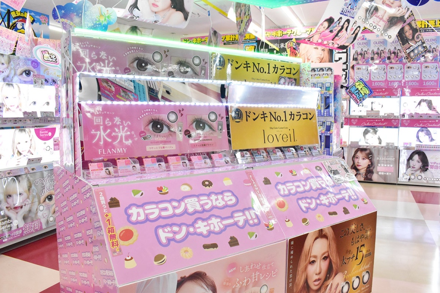 またドンキといえば、カラコンが豊富なことでも知られるが、交野店では50ブランド以上を展開、こちらも“府内最大級”の品揃えとなっている。また、鏡を見ながらサンプルのカードを合わせることで装着イメージが分かる「お試し用レンズカード」は、全国でも初導入となるシステムだ。