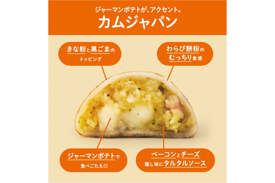 「カムジャパン」(1個420円)の中身は、ベーコンとチーズを加えたホクホク食感のポテトベースに、タルタルソースを合わせたジャーマンポテトになっている。そして、わらび餅粉が入ったもっちり柔らかな生地で包んで蒸し上げ、きな粉と黒ごまをトッピング。