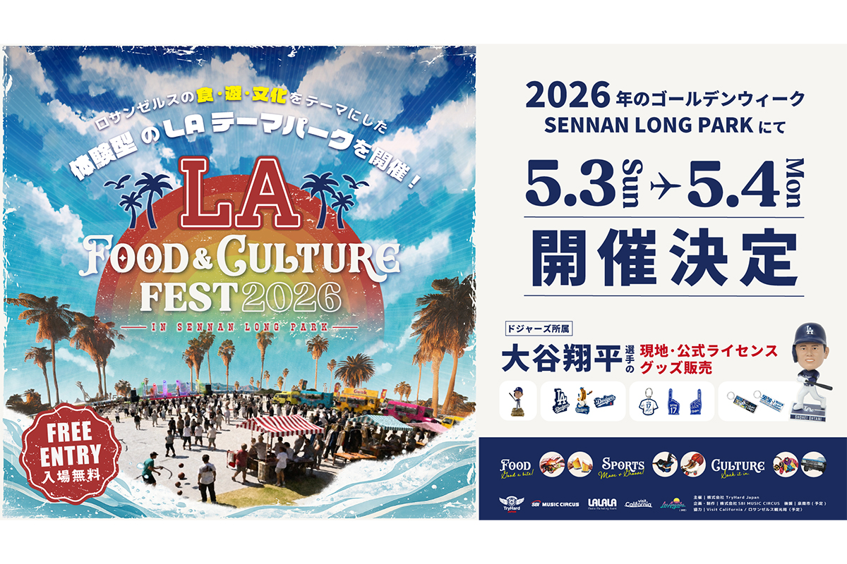 西海岸カルチャーをテーマにしたフェス『LA FOOD & CULTURE FEST』が、「泉南ロングパーク(SENNAN LONG PARK)」(大阪府泉南市)にて5月3日・4日に開催される。