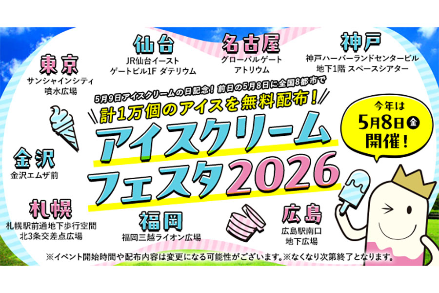 アイスの無料配布がおこなわれるイベント『アイスクリームフェスタ2026』が5月8日、全国8都市で開催。関西では、「神戸ハーバーランドセンタービル スペースシアター」(神戸市中央区)で実施される。