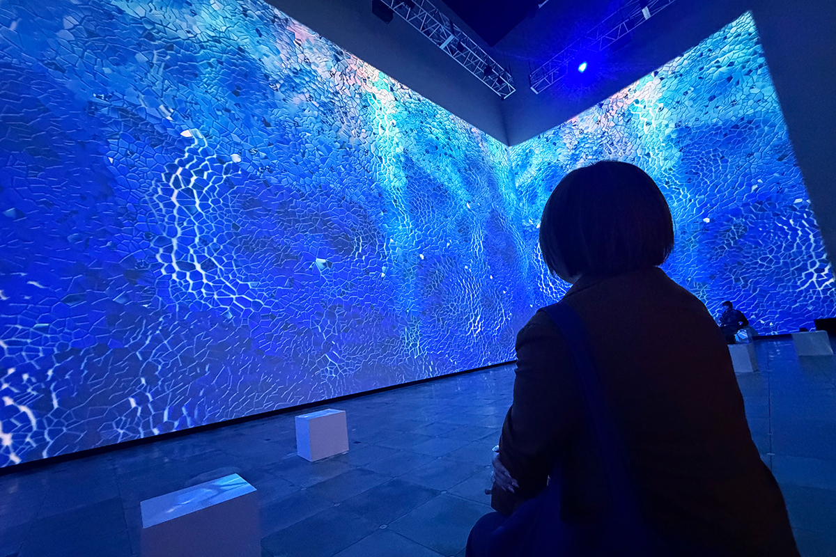 さらにエリア6「永遠の聖堂」では、未完の聖堂として100年以上に渡って建設が続く「サグラダ・ファミリア」の、誕生から現在までをダイナミックな映像・音・演出で辿る。同展示は、東京会場が約4mの高さの壁に投影されていたのに対し、大阪会場では約10mにサイズアップ。