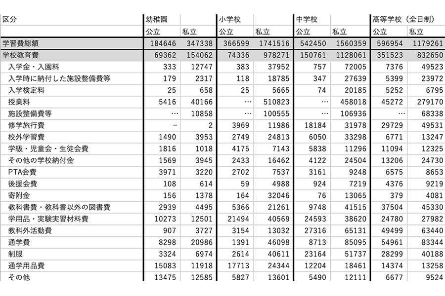 ちなみに、文部科学省の「令和5年度 子供の学習費調査」によると、私立高校(全日制)に通う生徒の「補助学習費」は平均23万8,422円となっています。これには塾代や通信教育費などが含まれ、スポーツや音楽などの習い事費用は含まれていません。学校外でもこれほどの負担があることは見逃せません。